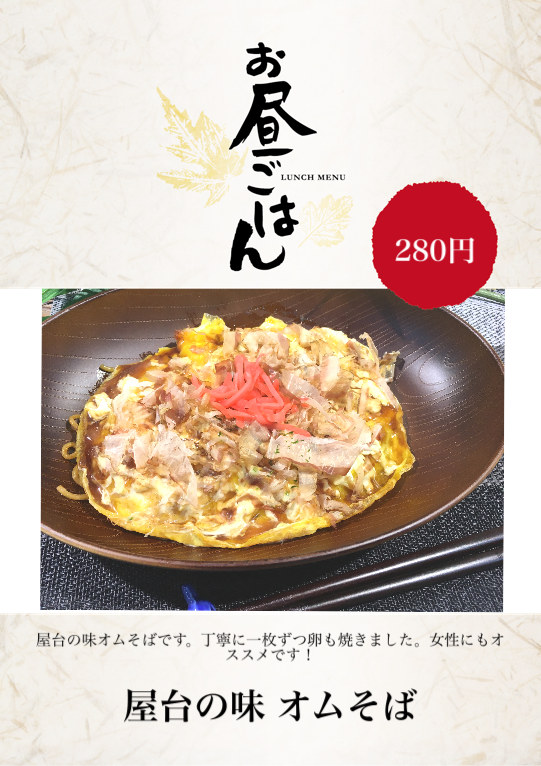 屋台の味オムそばです。丁寧に一枚ずつ卵も焼きました。女性にもオススメです!