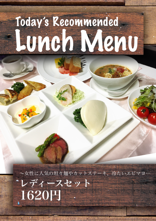 〜女性に人気の坦々麺やカットステーキ、冷たいエビマヨ、デザートプレートワンドリンク付、盛りだくさんランチ〜