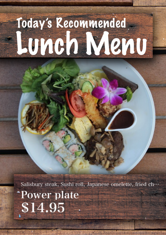 Salisbury steak, Sushi roll, Japanese omelette, fried chicken, fried shrimp, burdock, green leaf salad