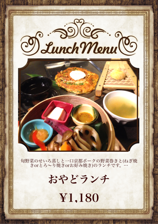 旬野菜のせいろ蒸しと一口京都ポークの野菜巻きと(ねぎ焼きorとろ〜り焼きorお好み焼き)のランチです。