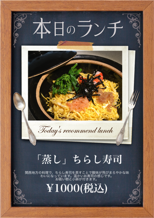 関西地方の料理で、ちらし寿司を蒸すことで酸味が飛びまろやかな味わいになっています。温かいお寿司の感じです。