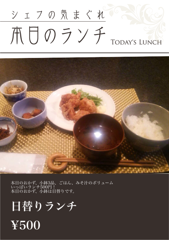 本日のおかず、小鉢3品、ごはん、みそ汁のボリュームいっぱいランチ500円!