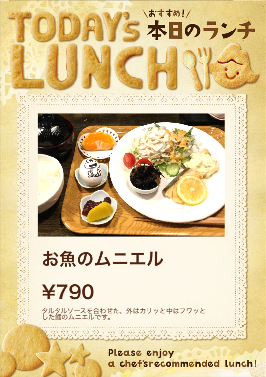 タルタルソースを合わせた、外はカリッと中はフワッとした鱈のムニエルです。