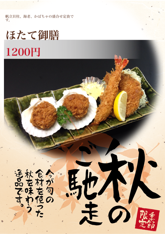 帆立貝柱、海老、かぼちゃの盛合せ定食です。