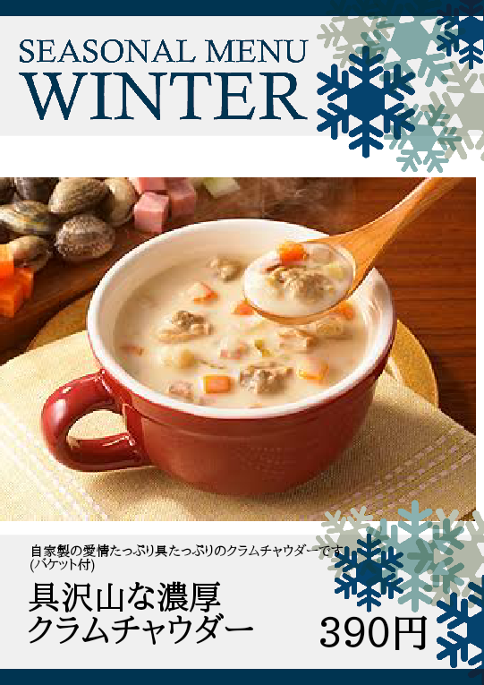 自家製の愛情たっぷり具たっぷりのクラムチャウダーです