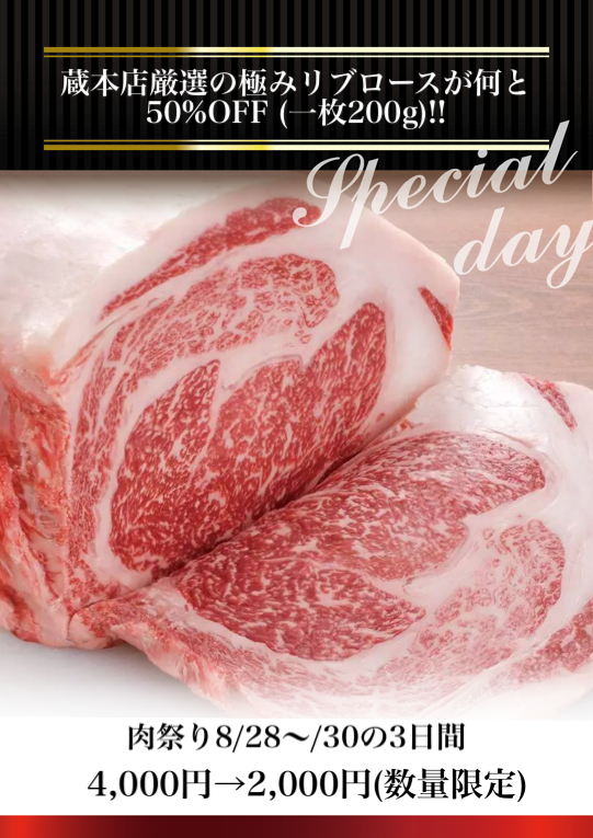 蔵本店厳選の極みリブロースが何と50%OFF (一枚200g)!!