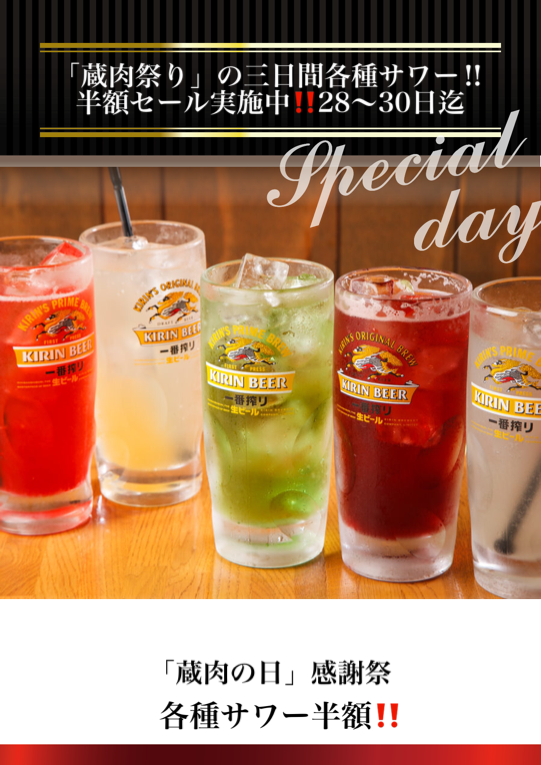 • 「蔵肉祭り」の三日間各種サワー‼︎半額セール実施中‼️28〜30日迄