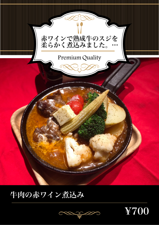 赤ワインで熟成牛のスジを柔らかく煮込みました。