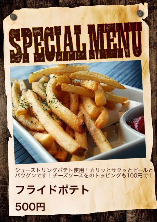 シューストリングポテト使用!カリッとサクッとビールとの相性バツグンです!チーズソースをのトッピングも100円で!
