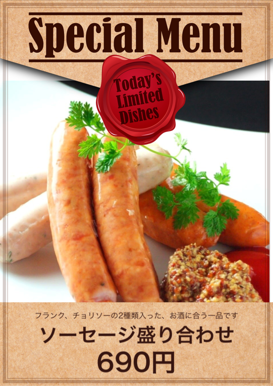フランク、チョリソーの2種類入った、お酒に合う一品です