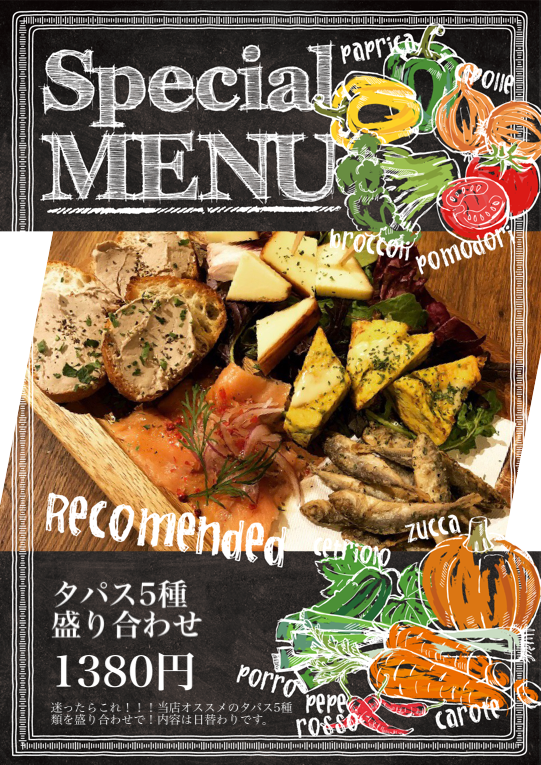 迷ったらこれ!!!当店オススメのタパス5種類を盛り合わせで!内容は日替わりです。