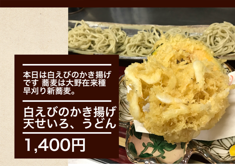 • 本日は白えびのかき揚げです 蕎麦は大野在来種 早刈り新蕎麦。