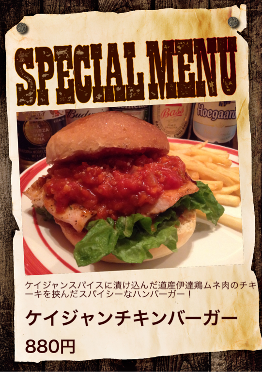 ケイジャンスパイスに漬け込んだ道産伊達鶏ムネ肉のチキンステーキを挟んだスパイシーなハンバーガー!