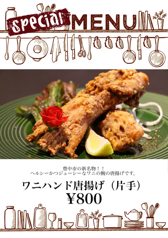ヘルシーかつジューシーなワニの腕の唐揚げです。