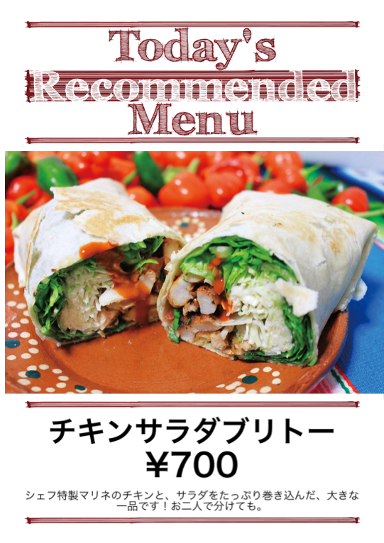 シェフ特製マリネのチキンと、サラダをたっぷり巻き込んだ、大きな一品です!お二人で分けても。