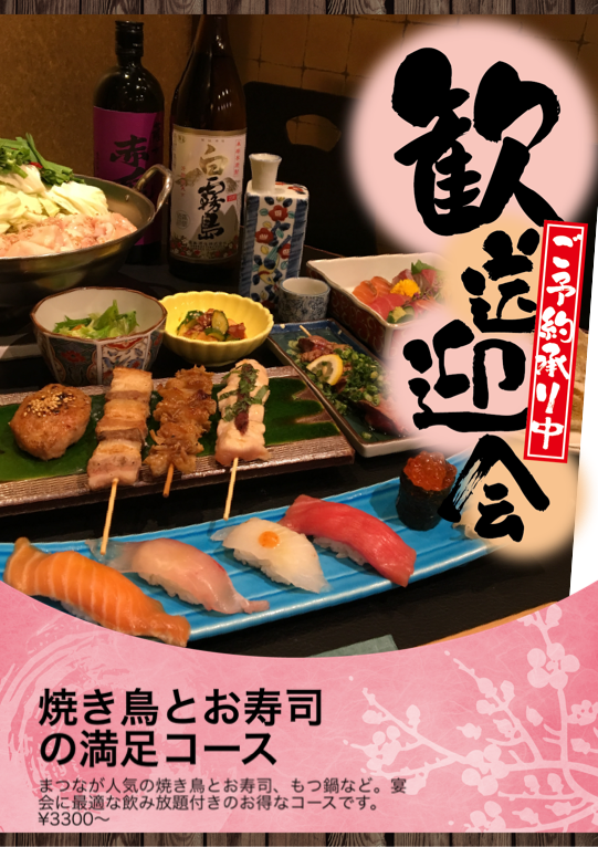 まつなが人気の焼き鳥とお寿司、もつ鍋など。宴会に最適な飲み放題付きのお得なコースです。¥3300〜
