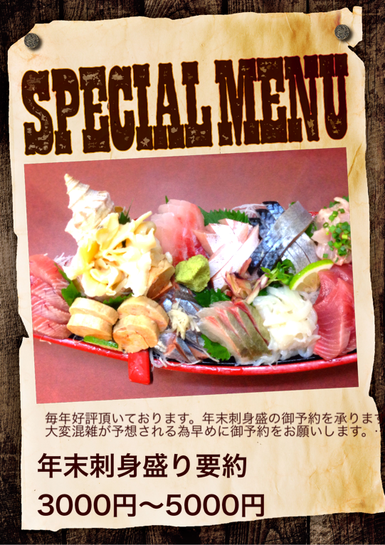 毎年好評頂いております。年末刺身盛の御予約を承ります。
