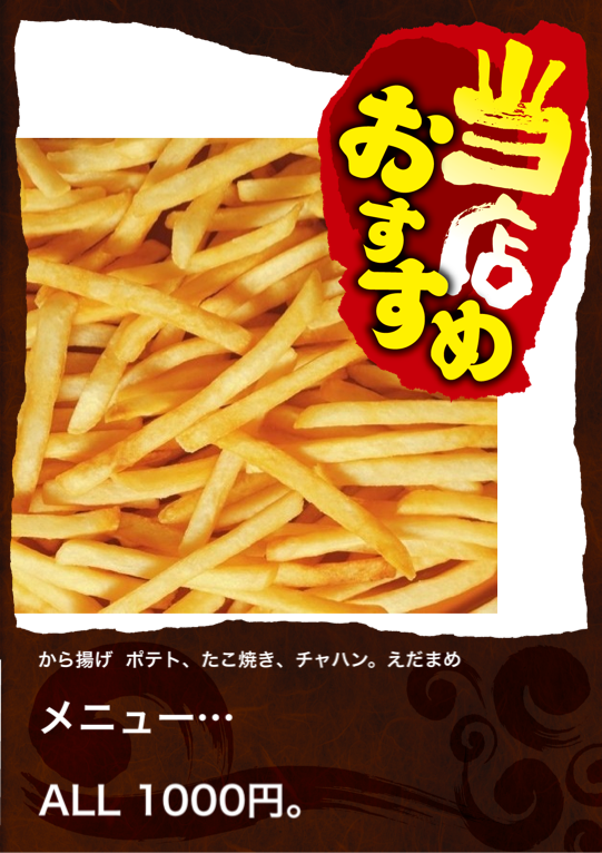 から揚げ ポテト、たこ焼き、チャハン。えだまめ