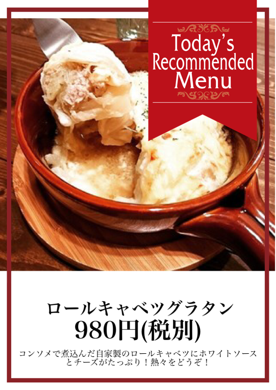 コンソメで煮込んだ自家製のロールキャベツにホワイトソースとチーズがたっぷり!熱々をどうぞ!