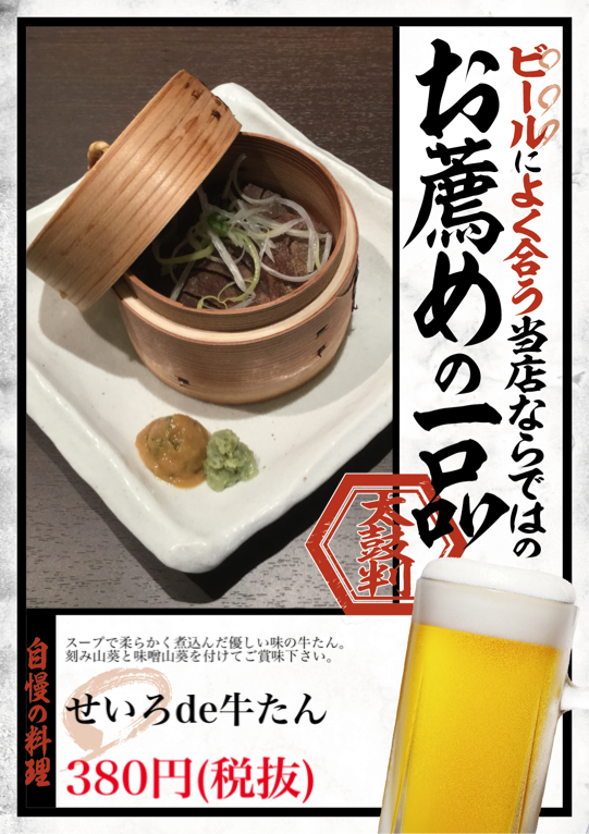 スープで柔らかく煮込んだ優しい味の牛たん。 刻み山葵と味噌山葵を付けてご賞味下さい。