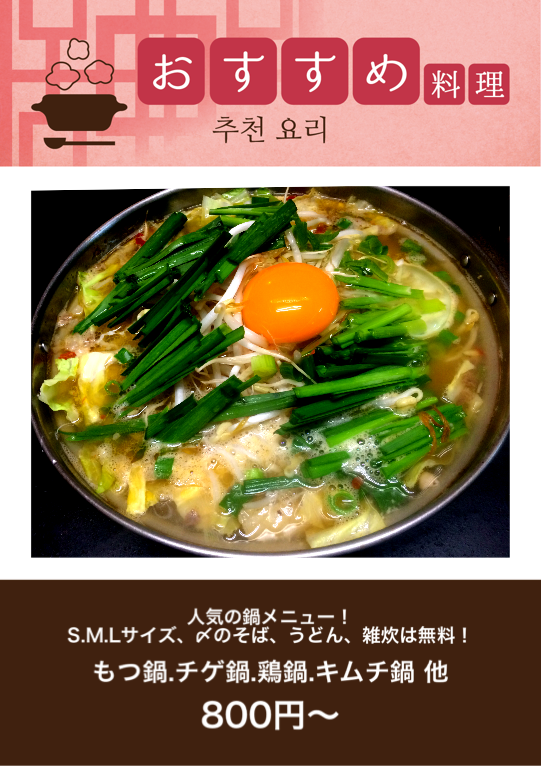 もつ鍋.チゲ鍋.鶏鍋.キムチ鍋 他