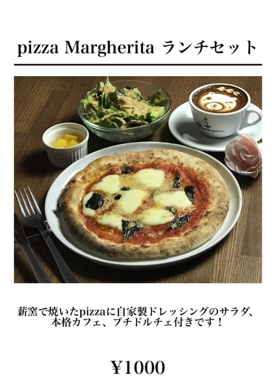 薪窯で焼いたpizzaに自家製ドレッシングのサラダ、本格カフェ、プチドルチェ付きです!