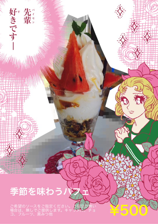 ご希望のソースをご指定ください。ご指定が無い場合は、無しでご提供します。キャラメル、チョコ、フルーツ、黒みつ他