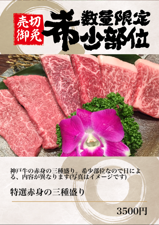 神戸牛の赤身の三種盛り。希少部位なので日による、内容が異なります(写真はイメージです)