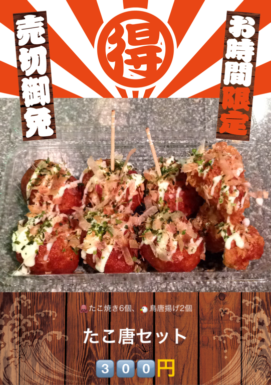 🐙たこ焼き6個、🐔鳥唐揚げ2個