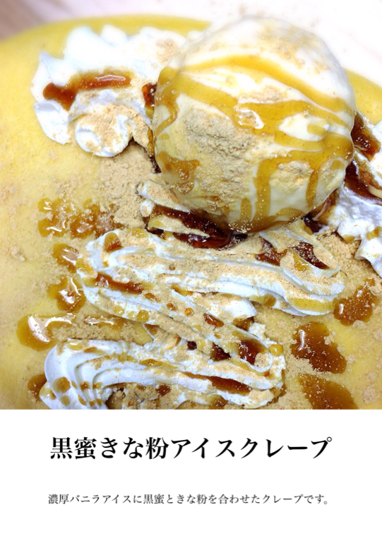 濃厚バニラアイスに黒蜜ときな粉を合わせたクレープです。