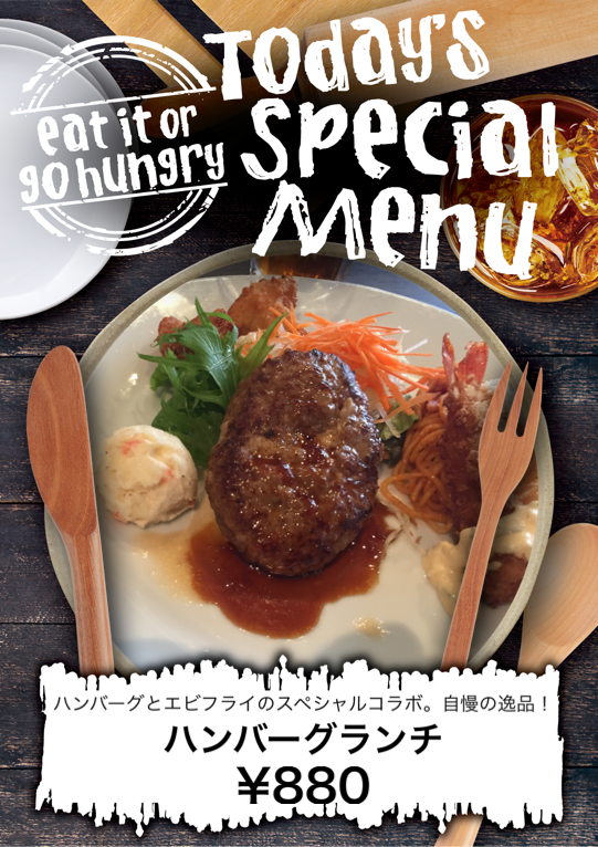 ハンバーグとエビフライのスペシャルコラボ。自慢の逸品!