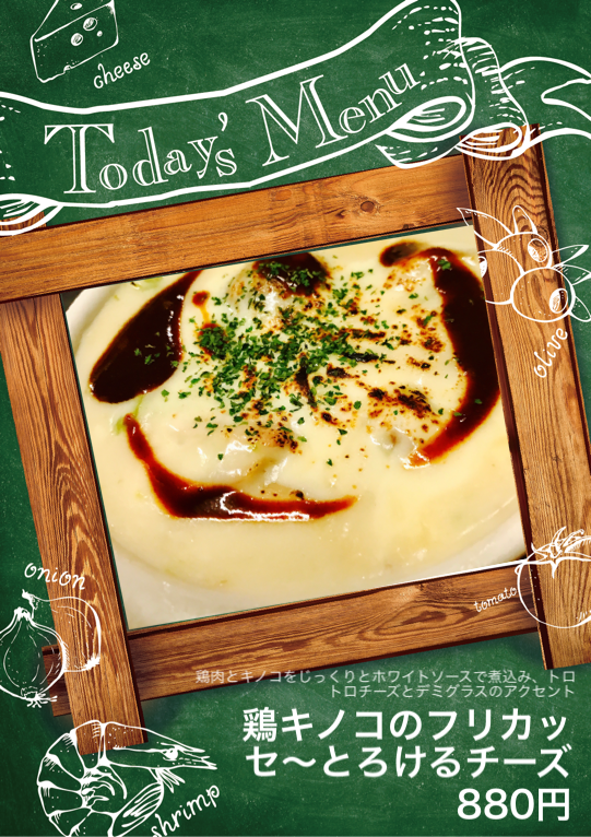 鶏肉とキノコをじっくりとホワイトソースで煮込み、トロトロチーズとデミグラスのアクセント