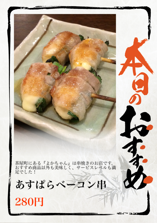 茶屋町にある『よかちゃん』は串焼きのお店です。おすすめ商品以外も美味しく、サービスレベルも満足でした!