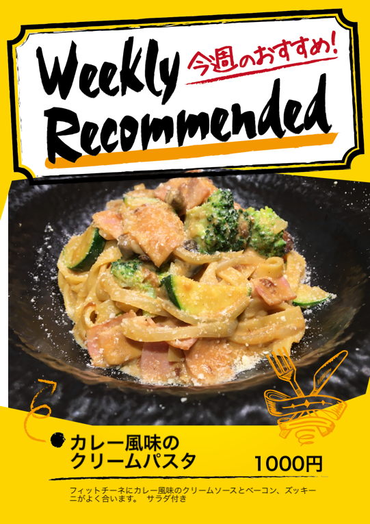 フィットチーネにカレー風味のクリームソースとベーコン、ズッキーニがよく合います。 サラダ付き