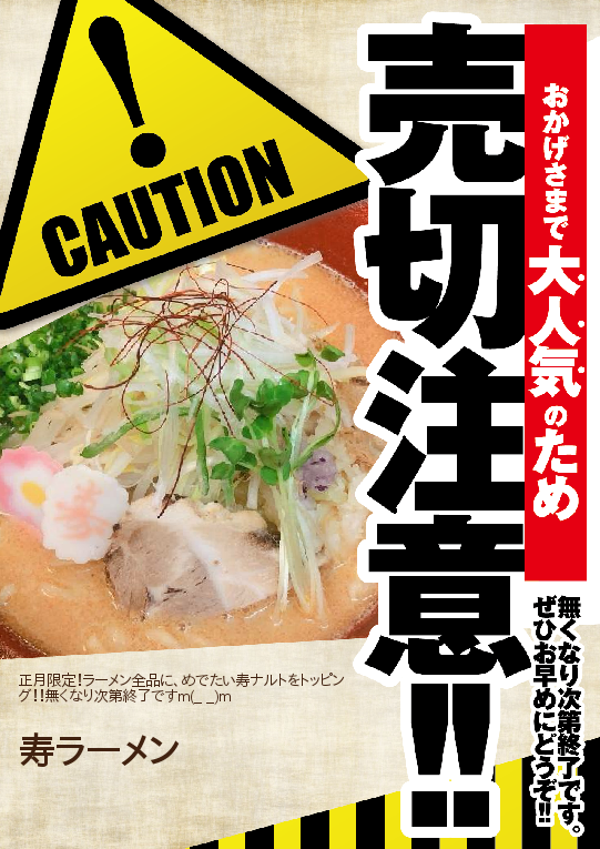 正月限定!ラーメン全品に、めでたい寿ナルトをトッピング!!無くなり次第終了ですm(_ _)m