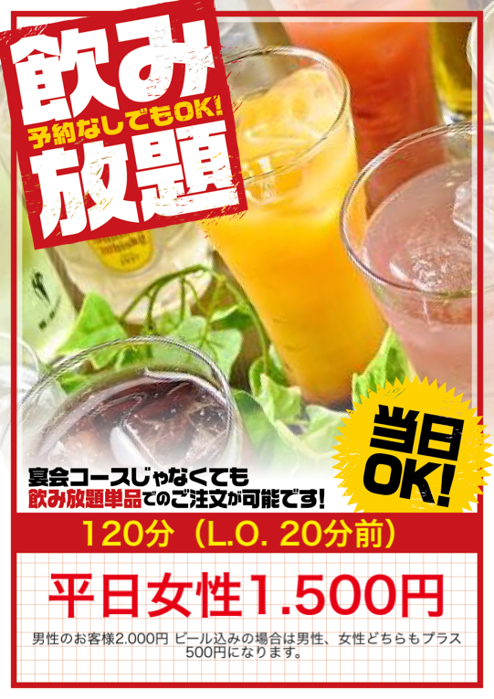 男性のお客様2.000円 ビール込みの場合は男性、女性どちらもプラス500円になります。