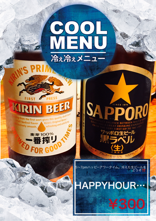 5〜7pmハッピーアワータイム。冷えた生ビールをどうぞ‼️