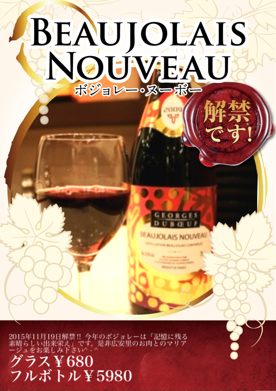2015年11月19日解禁‼︎ 今年のボジョレーは「記憶に残る素晴らしい出来栄え」です。是非広安里のお肉とのマリアージュをお楽しみ下さい^ - ^